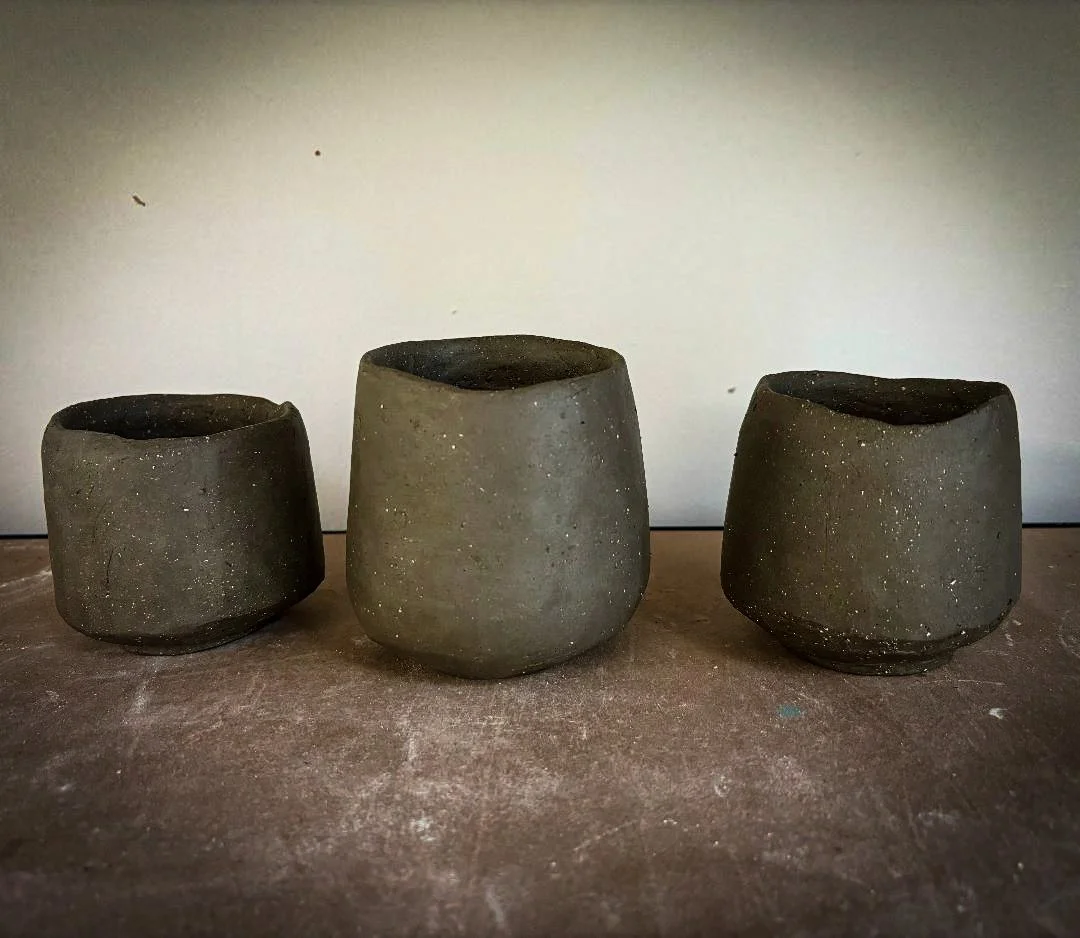 Subsequently, I started by browsing through images of 2023 works that excited me the most. I decided I would like to become closer the the organic nature of the material I work with. I like the notion of the Japanese philosophy of ‘happiness in the accident” and elemental firing techniques that have a direct link to fire and it’s spontaneity. I realised that I have, for the moment, fallen out of love with the potter’s wheel. I find inspiration in the raw work of Violet Bond (Instagram : @violetbond) and Melissa Weiss (Instagram @melissaweisspottery). Both artists harvest their own ‘wild’ clay from the landscapes they live in, maintaining a close bond to the earth. Both use hand building techniques to produce pots with integrity and an aesthetic that speaks to me.