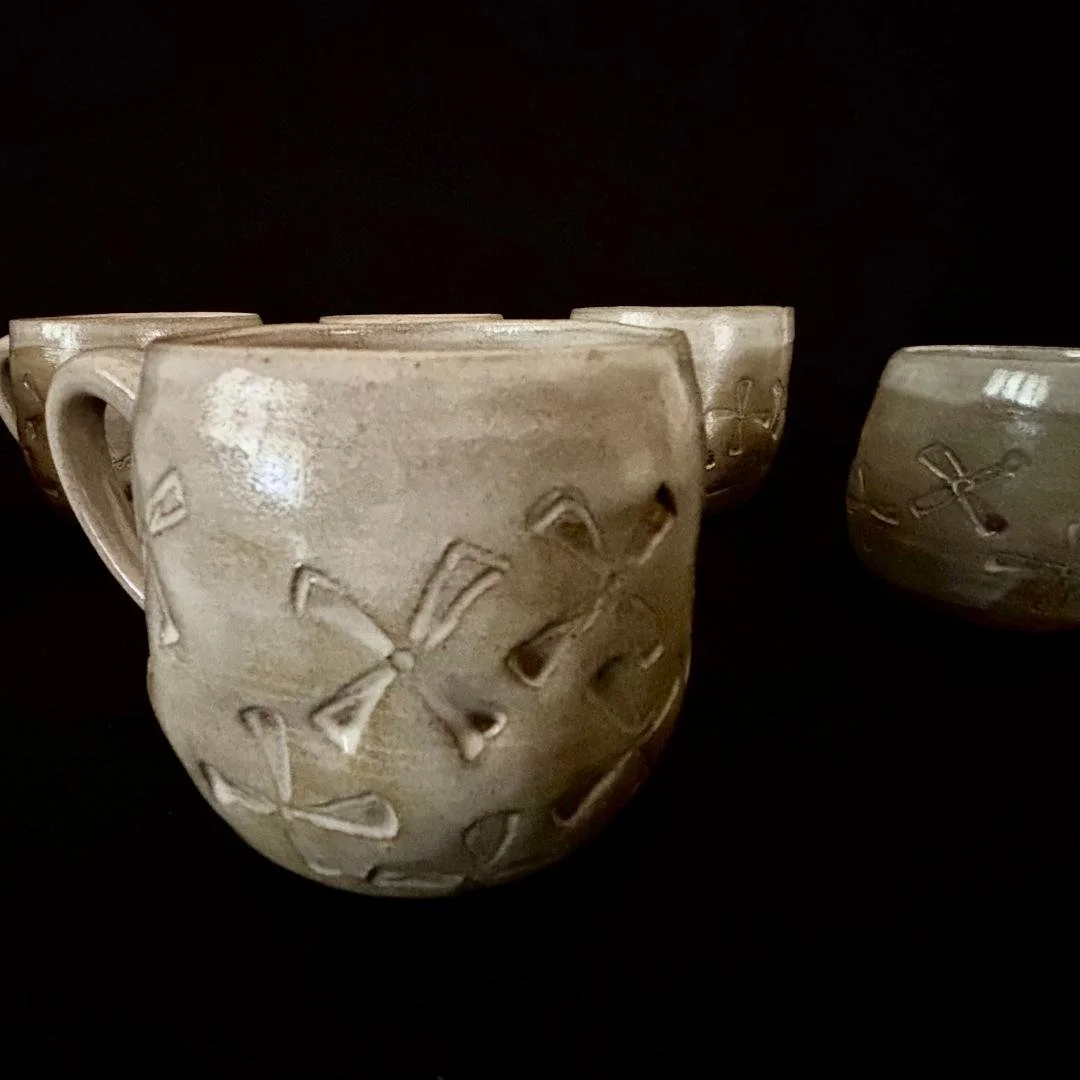 Also fresh out of the kiln this week are cups, mugs and bowls which feature the popular “wide eyes” pattern. Someone asked at our last market where I found the inspiration for this design. A lot of my surface design is painted or carved by hand (sgraffito) during the making process. Recurring motifs include leaves and circles in particular. They have provided on ongoing source of exploration for a number of years now. “Wide Eyes” have evolved from several variations of circles and dots and the incorporation of sgraffito on the outer ring. So, this design is not the result of a light bulb moment but rather forms part of a work in progress.